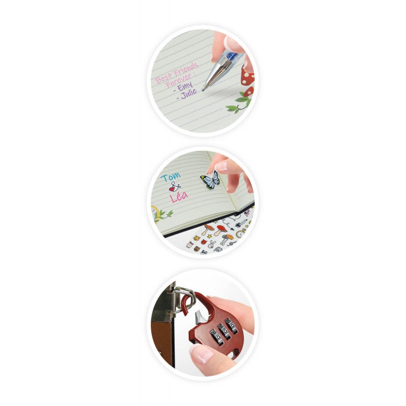 Inclui: 1 caderno com 120 páginas, 1 conjunto de brilhantes (diamanté), 1 aplicador com ponta de cera, 1 tabuleiro pequeno, 1 cadeado, 8 canetas de gel, 1 caneta UV e 1 folha de autocolantes.
