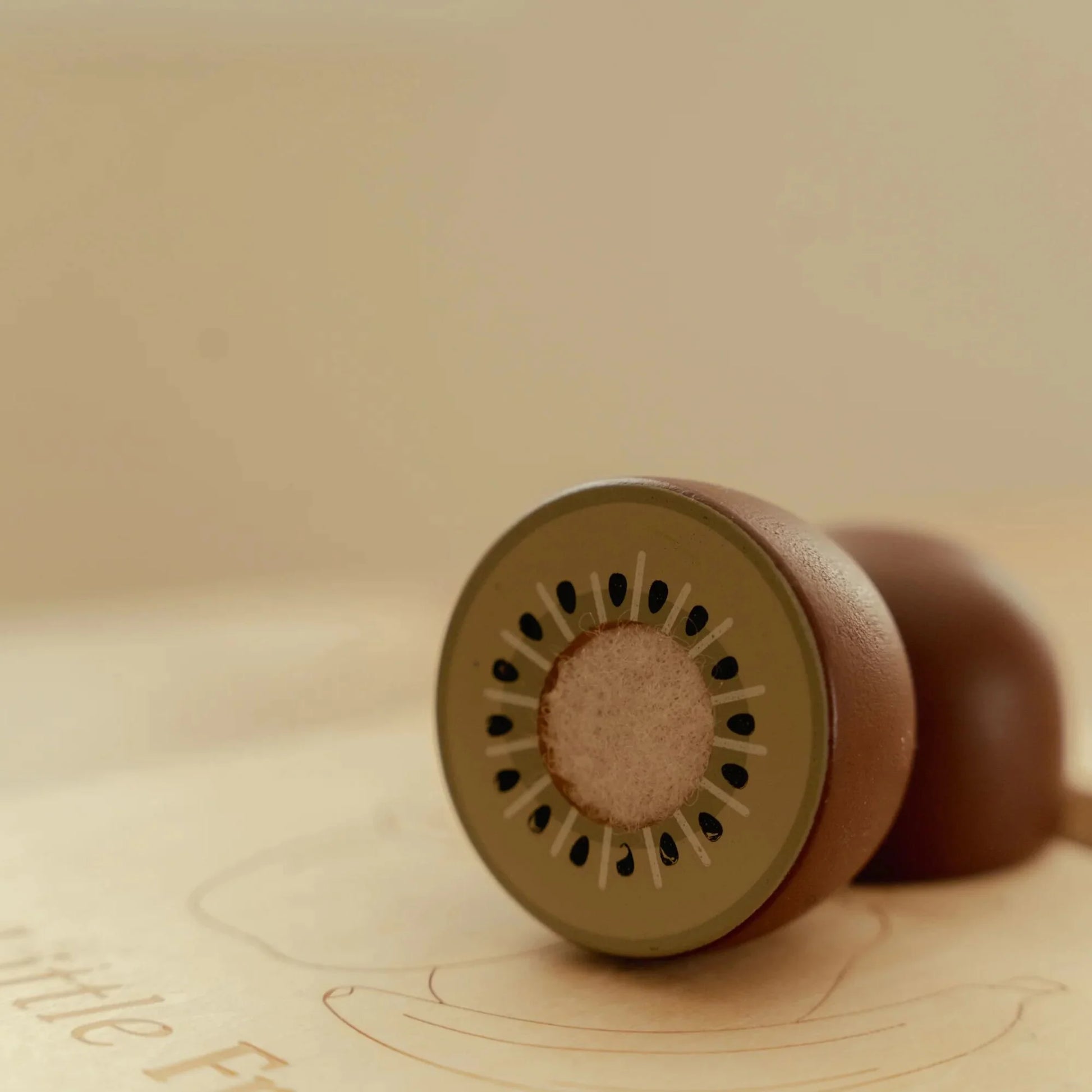 It includes a cutting board and a wooden knife to divide the fruits in half and reveal their interior.