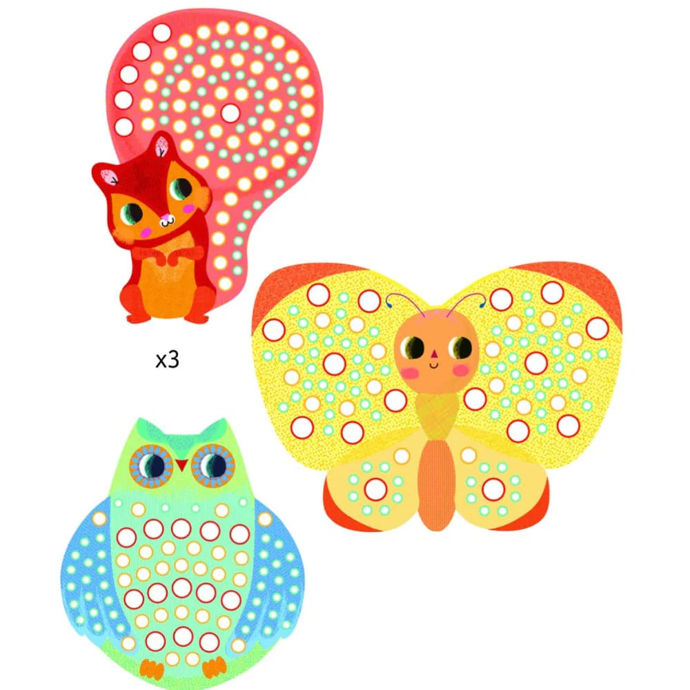 As crianças podem decorar os animais aplicando círculos coloridos e com padrões, criando mosaicos simples e divertidos — perfeitos para mãos pequeninas e para os primeiros projetos criativos.