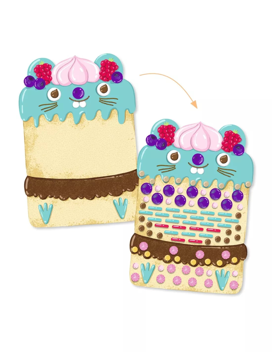 Uma atividade de colagem para criar bolos muito fofos e aprender sobre mosaicos. Seguindo o livrinho com as instruções, a criança cola os autocolantes coloridos e ilustrados para decorar as 3 deliciosas silhuetas.