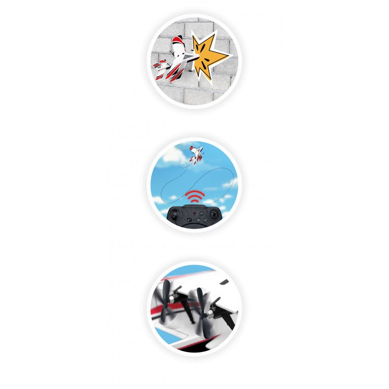Inclui: 1 avião, 1 comando à distância, 2 motores, hélices sobressalentes, 1 bateria, 1 cabo USB e 1 folha de instruções.