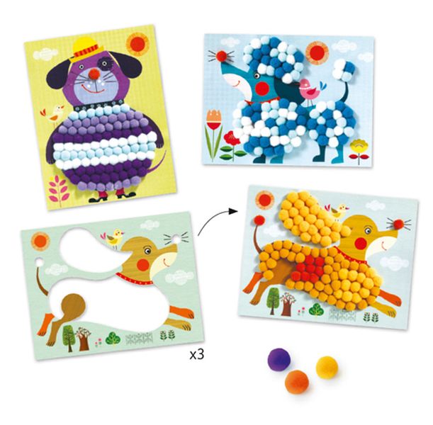 Inclui: 3 cartões com silhueta de animais (25 x 20 cm) com parte autocolante, 150 pompons e 1 livreto explicativo.