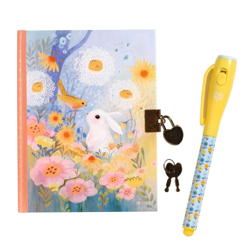 Um pequeno caderno secreto com caneta de tinta invisível para escreveres e desenhares todos os teus segredos! Basta passar a luz UV para revelar tudo o que está escondido.