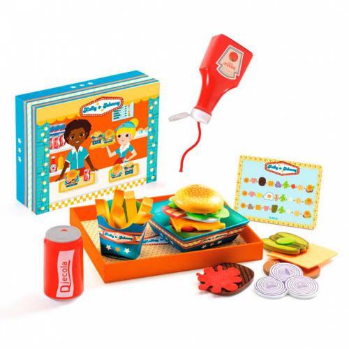 Contém: 1 bebida em lata, 1 embalagem de ketchup, 8 ingredientes, 1 caixa de hambúrgueres, 6 batatas fritas em madeira com 1 cartão para as colocar, 1 menu, 1 caixa em madeira.