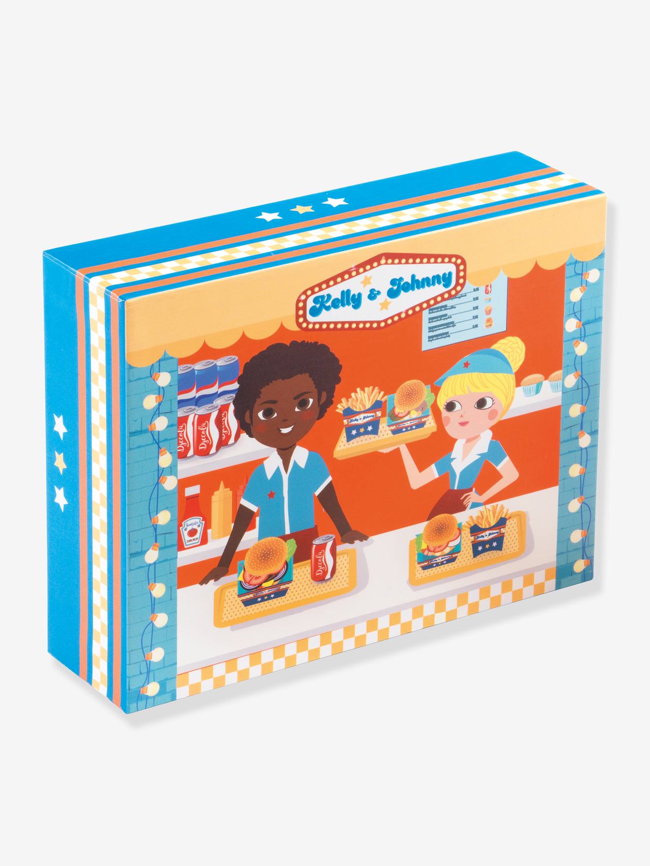 Uma caixa de madeira colorida que se transforma num restaurante de hambúrgueres, preparado pelos personagens Kelly e Johnny.