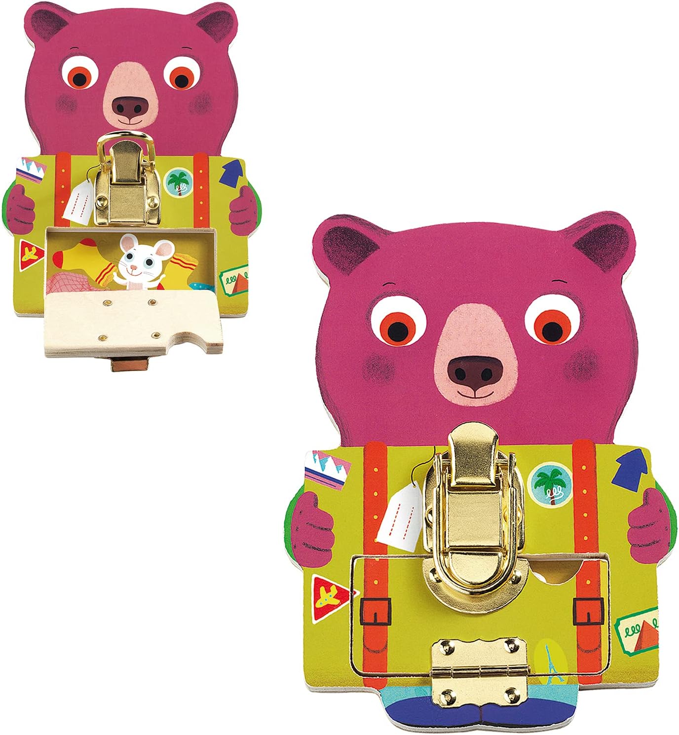 Conjunto de três animais de madeira com fechaduras na barriga para abrir e fechar. Abre a fechadura e vê o que encontras lá dentro! Estimula o desenvolvimento da motricidade fina e destreza.
