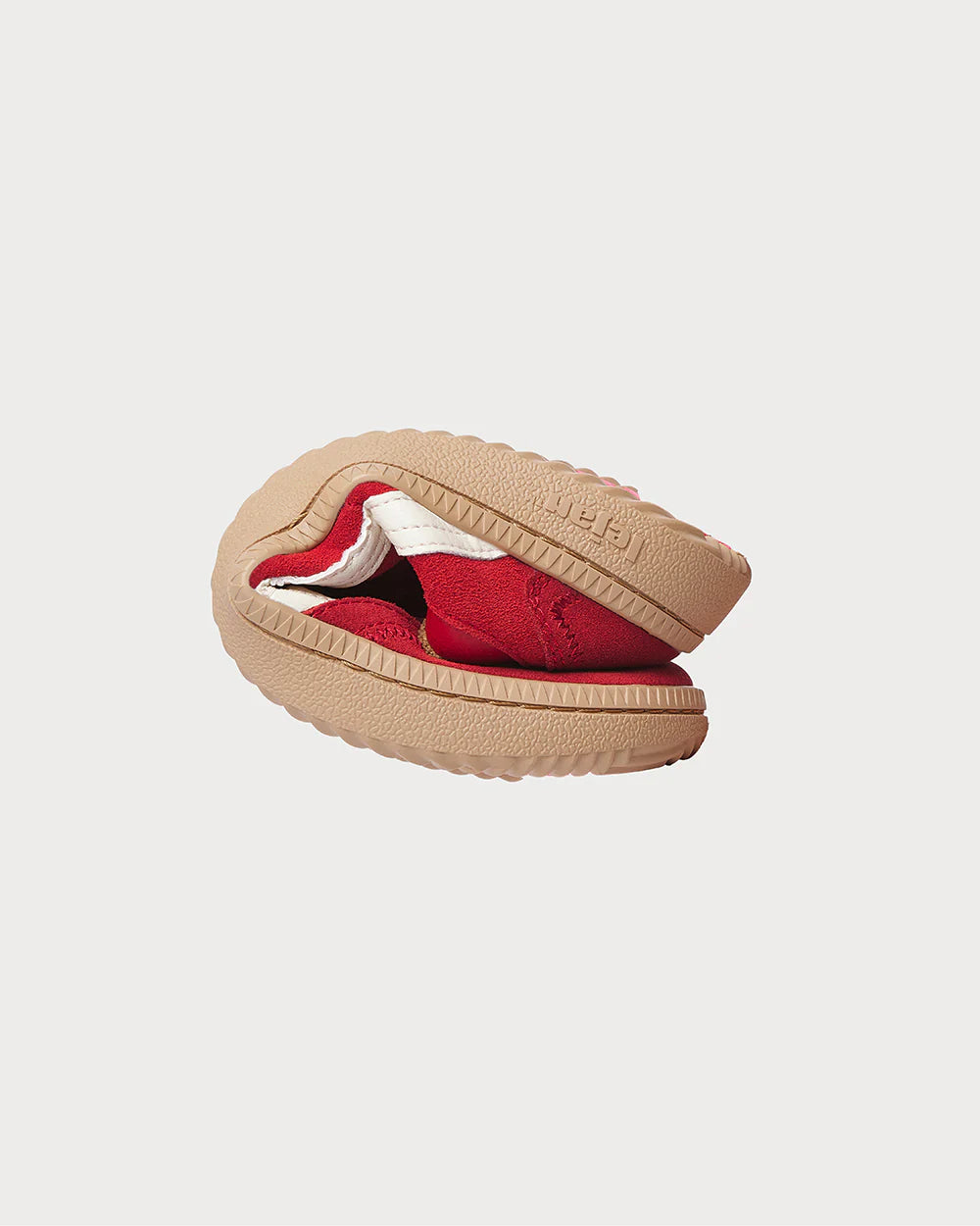 O exterior é feito de camurça e couro e o forro é de terry de algodão, para boa respirabilidade do calçado.